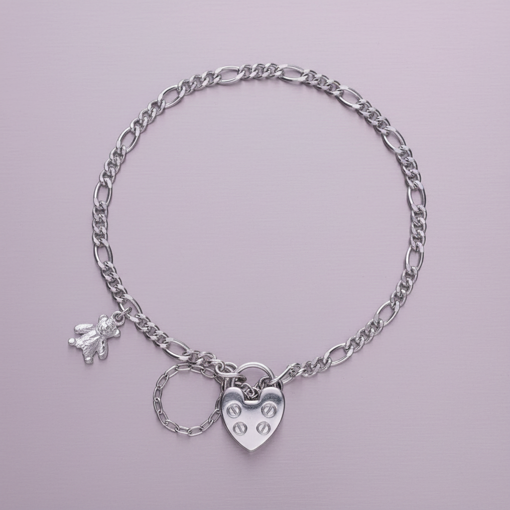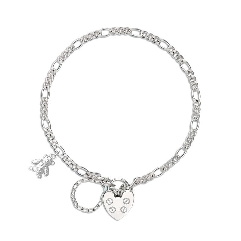My Little Angel Brand Figaro Bracelet with Teddy Bear Charm in Sterling Silver.