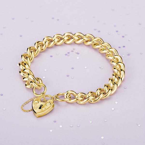 Silver Essentials Solid Heavy Curb Chain Bracelet With Heart Padlock in Sterling Silver under 14K Yellow Gold Plating